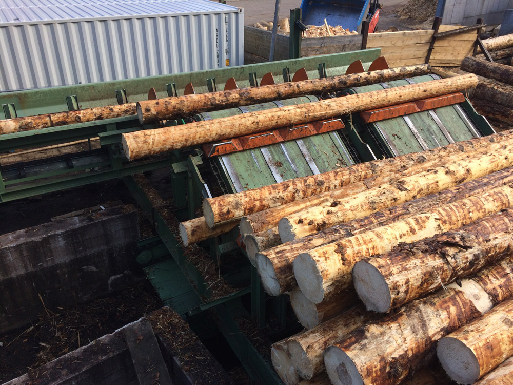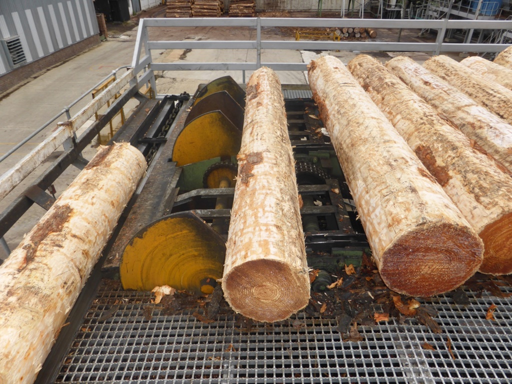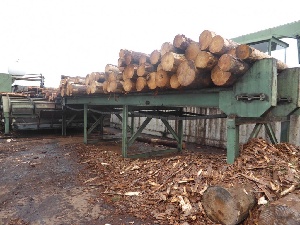 Die Besonderheit bei diesem Band ist, dass es eine spezielle Neigung hat, damit die Stämme direkt vorzentriert werden und problemlos in die Anlage befördert werden.