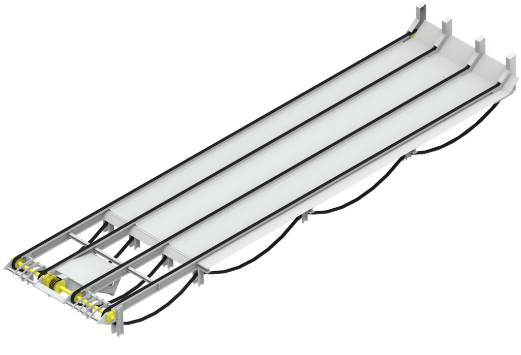 Die robuste Konstruktion ist für hohe mechanische Belastungen ausgelegt und gewährleistet einen sicheren Betrieb auch unter rauen industriellen Bedingungen. Der Förderer zeichnet sich durch eine hohe Verfügbarkeit aus und ist für den kontinuierlichen Einsatz in der Rundholzlogistik konzipiert.